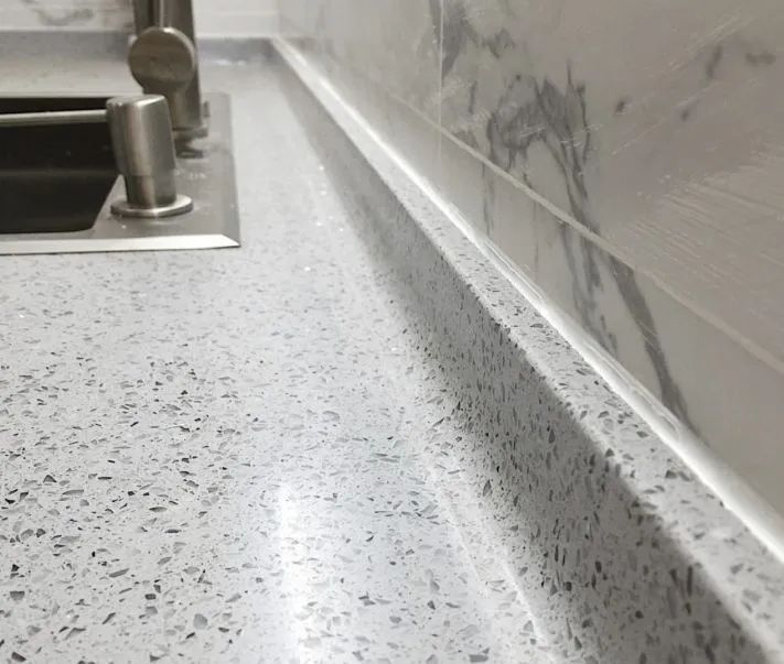 台面的内侧一般都要有防水条,挡住洗台面时的水渍或洗碗时的溅水进入瓷砖或橱柜。