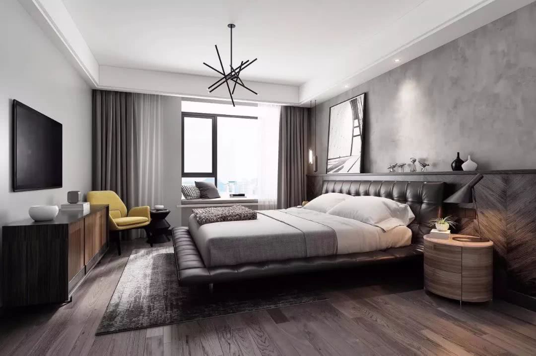 主卧延续了整体的设计理念,以灰色为主色调,用橙色为点缀色,独特个性的主灯设计,搭配不同的辅助光源,营造出温馨的氛围。