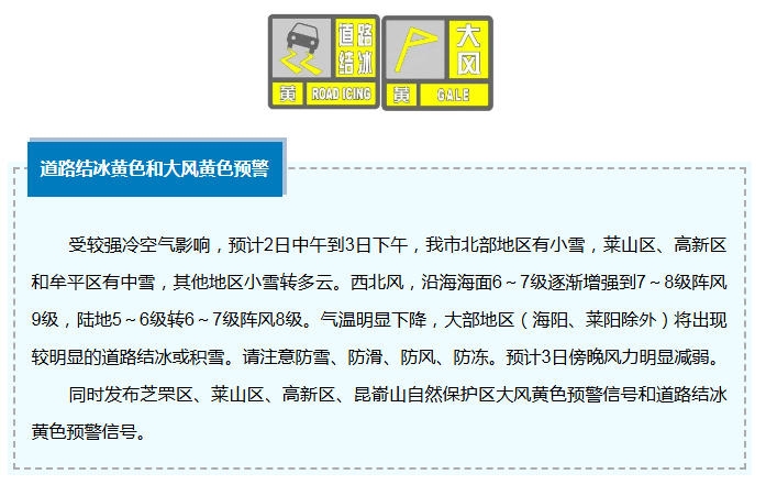 12月2日10时, 烟台市气象台发布 道路结冰黄色预警 继续发布大风黄色预警