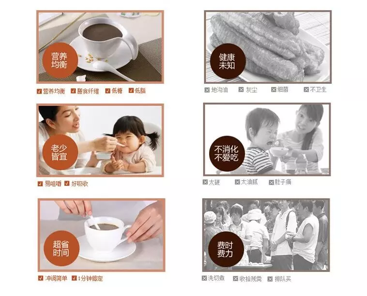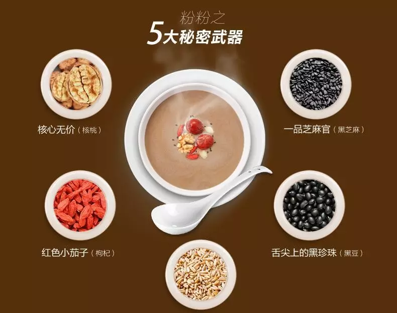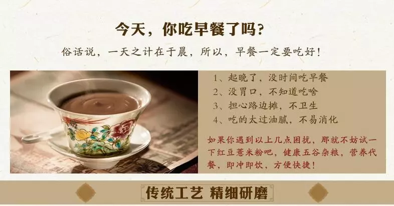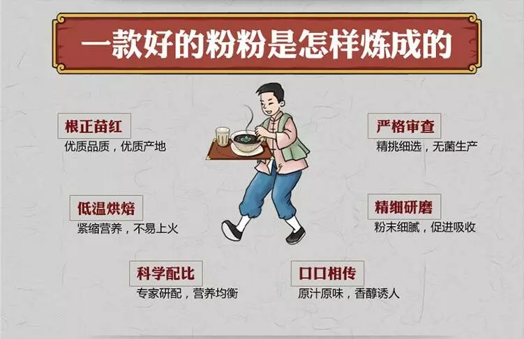 (五)友情提示:粗粮虽好,切不可随意搭配,以免引起食物相克以及上火。我们的产品,是严格按照营养比例科学搭配的,请放心食用。传统工艺、农家手艺,注重食品安全与营养,配料独特、设备先进,我们的五谷营养粉,绝非市面上随意搭配的杂粉,材料精挑细选,用的都是上等好料。我们只做良心产品,绝不添加任何添加剂、防腐剂!敬请监督!