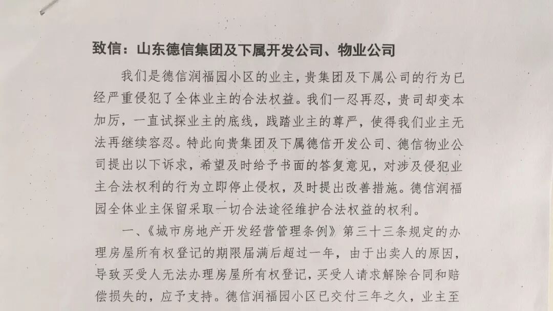 在民警进行协调后,业主同意以书面形式向德信集团提出诉求,且民警当面指定德信员工接收书面诉求。 但当业主将半数业主签字的书面诉求整理好要求接收时,同意接收诉求的德信员工出尔反尔,不承认自己同意接受该诉求。致使当日数十名业主顶着寒风等待长达两小时,最终在民警协调下才接收该书面回复。 半数业主签名的联名信,在提交时德信集团出尔反尔拒不接收
