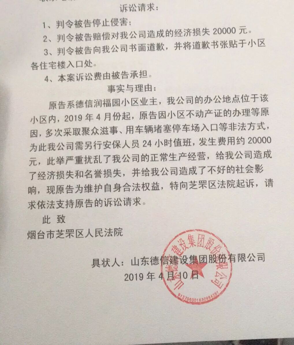 此后,被起诉业主积极安抚其他业主,配合相关部门工作。据多名受采访业主表示,“我们纯属是为了配合相关部门,因为我们相信相关部门介入,会给我们一个满意的答复。我们在小区内要求德信的领导亲自为我们做出解答,只希望领导能给我们最起码的尊重。并且对于侵犯全体业主权益的地方给我们一个权威的解释,我们并不存在任何违法行为。德信集团起诉业主的目的所有业主心知肚明。” 开发商组织无关人员到小区内 4月11日,小区内一名业主收到立案通知。经查,此案件由芝罘区人民法院立案,为当日起诉当日立案。据相关法律人士表示:“该起案件事由简单,按理应当进行诉调程序,如此迅速立案虽不大合常理,但程序不违规。” 与此同时,凤凰台街道办事处与凤凰台派出所领导也在积极与德信集团进行沟通。但被起诉业主仍在4月20日左右收到了法院通知,确定开庭时间为5月13日。 开庭的消息使全体业主更加对德信集团产生不满,在一天内自发分摊了上万元的律师费,聘请律师合法维权。受访业主纷纷表示:“我们只希望法律能给我们公正判决,德信集团侵犯全体业主权益反而状告业主,这种行为本身就带有威胁的目的,为的是让小区内其他业主不再维权。我们要求物业公示收支信息,我们要求公示办证进度,一项都没有达成。” - 标的额由32万元增加至36万元,“道歉信”“检讨书”成为法庭证据,业主痛斥德信集团无德无信