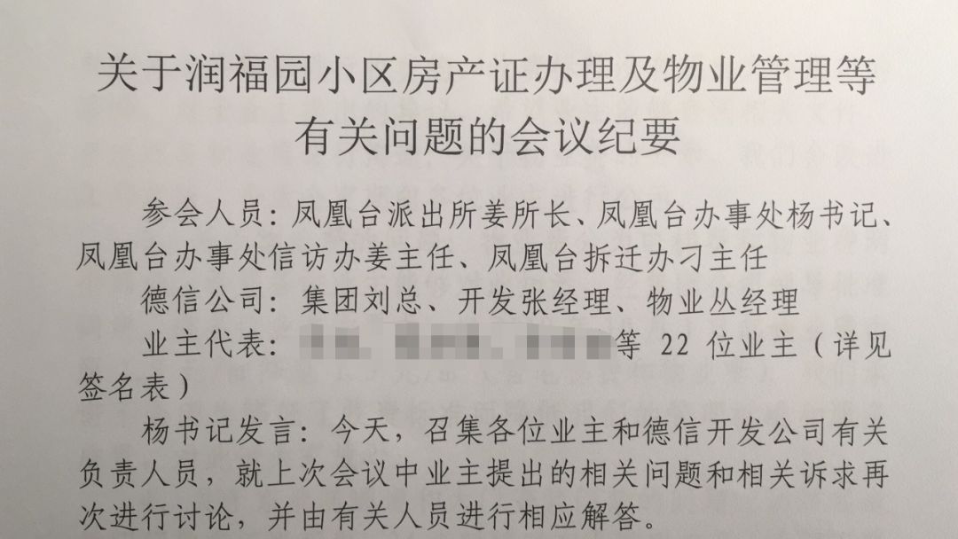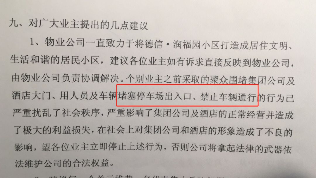 业主收到回复的同时,小区内一名业主收到了原告为山东德信建设股份有限公司和烟台德信恒隆酒店管理有限公司的两份诉状,称其聚众滋事,扰乱了其正常经营,索赔合计320000元。而事由就是小区内业主要求说明情况的停车杆,据多名业主反映,该停车杆为入住后私设,只允许酒店车辆任意通过,小区业主禁止通行,小区业主均对此有很大意见。 酒店合法入口,明确标明“小区车辆禁止通行” 德信润福园属芝罘区凤凰台街道,在事件发生后,凤凰台街道办事处及凤凰台派出所领导亲自前往小区协调处理此事。在两部门介入下,业主表示可以等待德信公司处理,但要求必须限时公开进度,且对起诉业主个人撤销诉讼请求。 两部门领导介入,协调被起诉业主写下书面“道歉信”表明态度,以此与德信集团相关领导沟通,从而撤诉平息事件。 相关部门介入时的会议纪要,此次会议以后业主在协调下写下“道歉信”,被德信集团当成攻击业主的证据