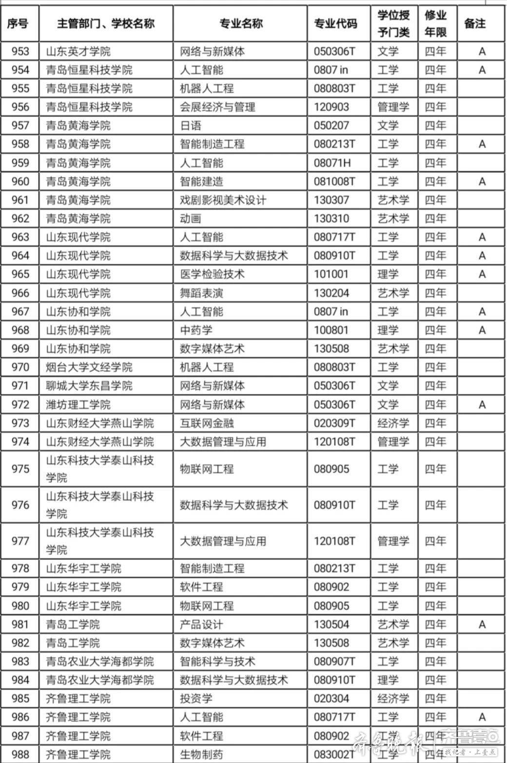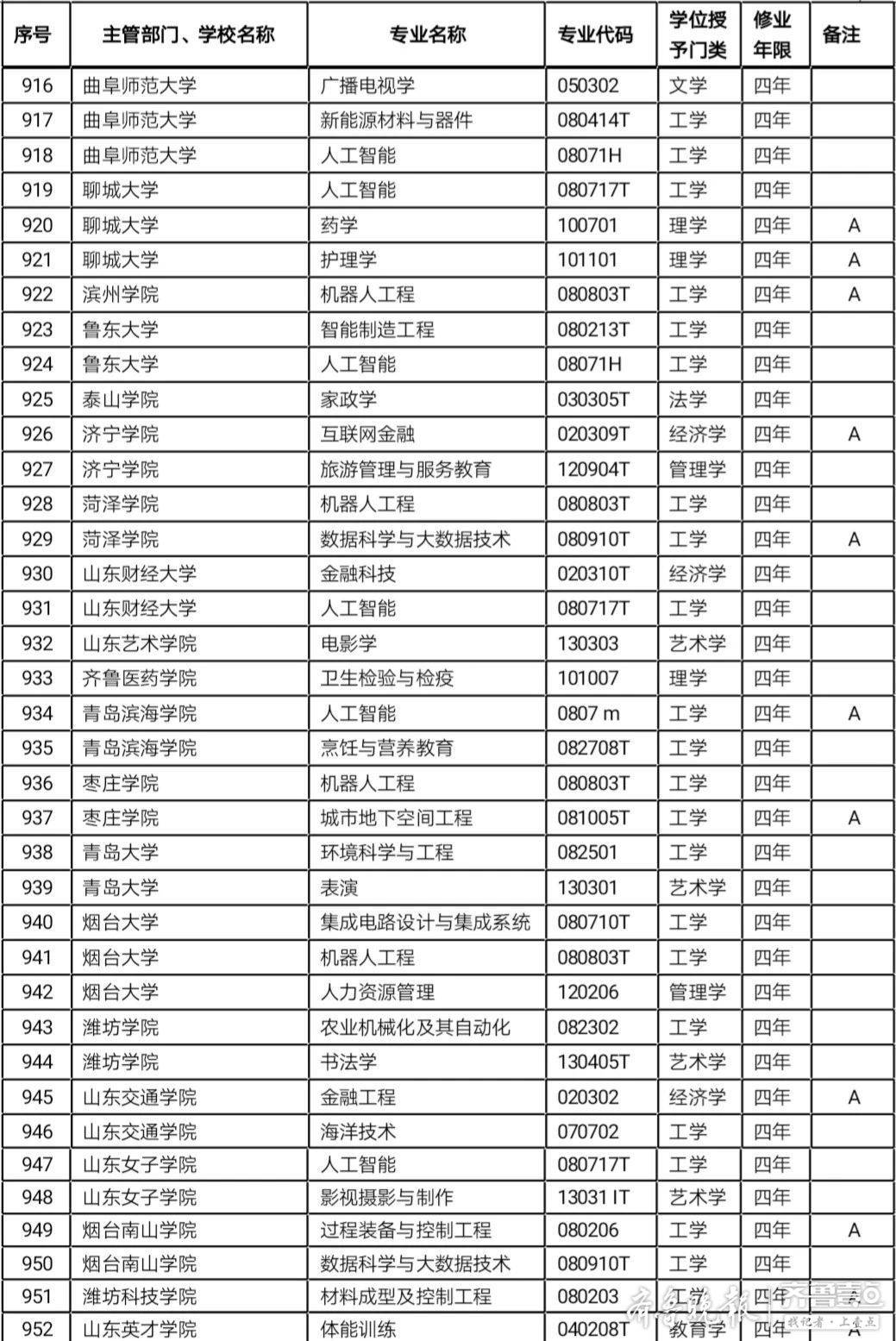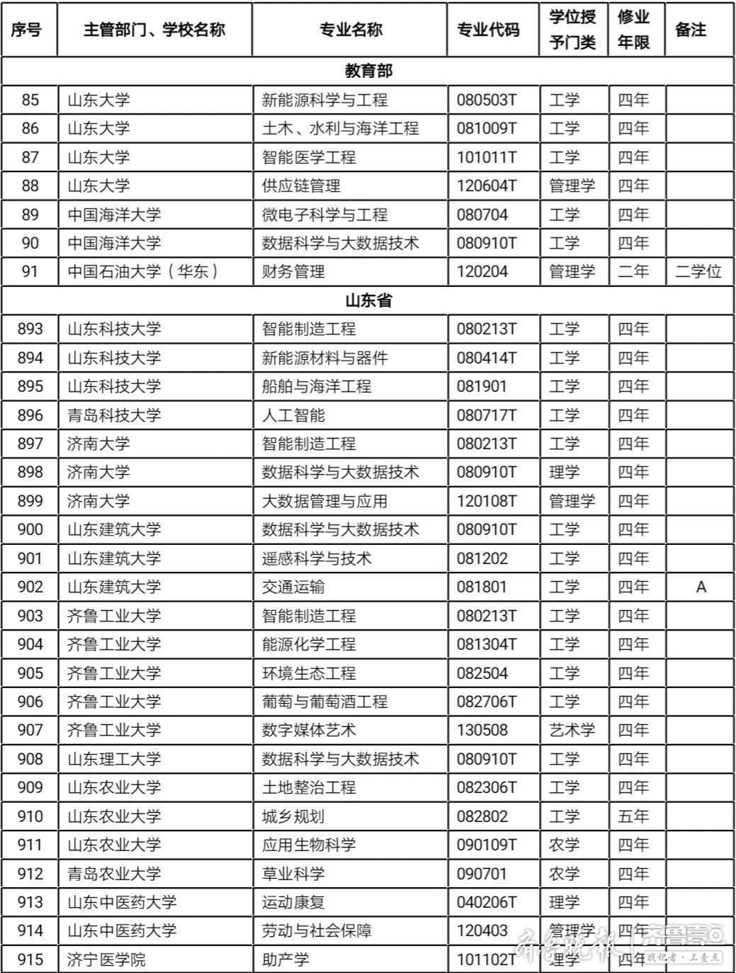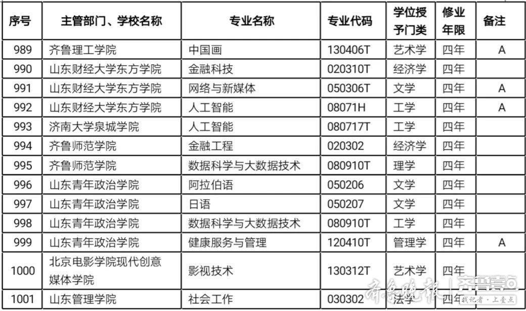 山东高校新增备案本科专业名单
