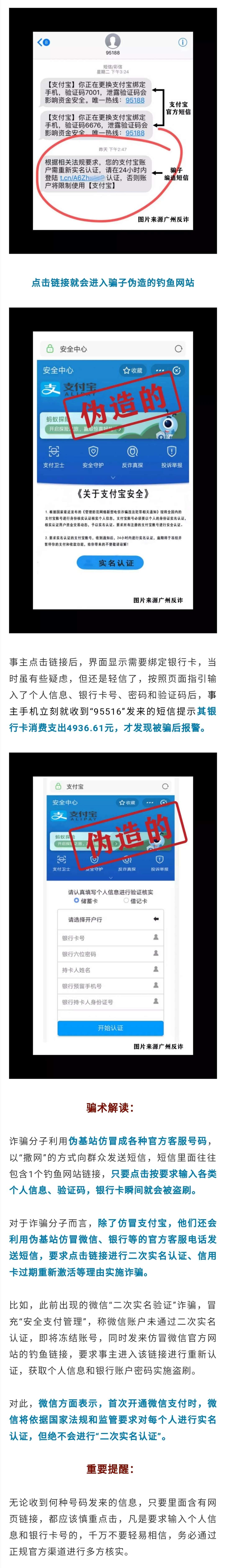这次受骗者收到的是冒充“95188”发送的短信,通过搜索发现这个号码确实是支付宝官方客服服务电话,但蹊跷的是,短信内容却是要求对支付宝账户重新进行认证,还附了一个网址链接,一旦点击输入个人信息和验证码,钱就会被快速转走……