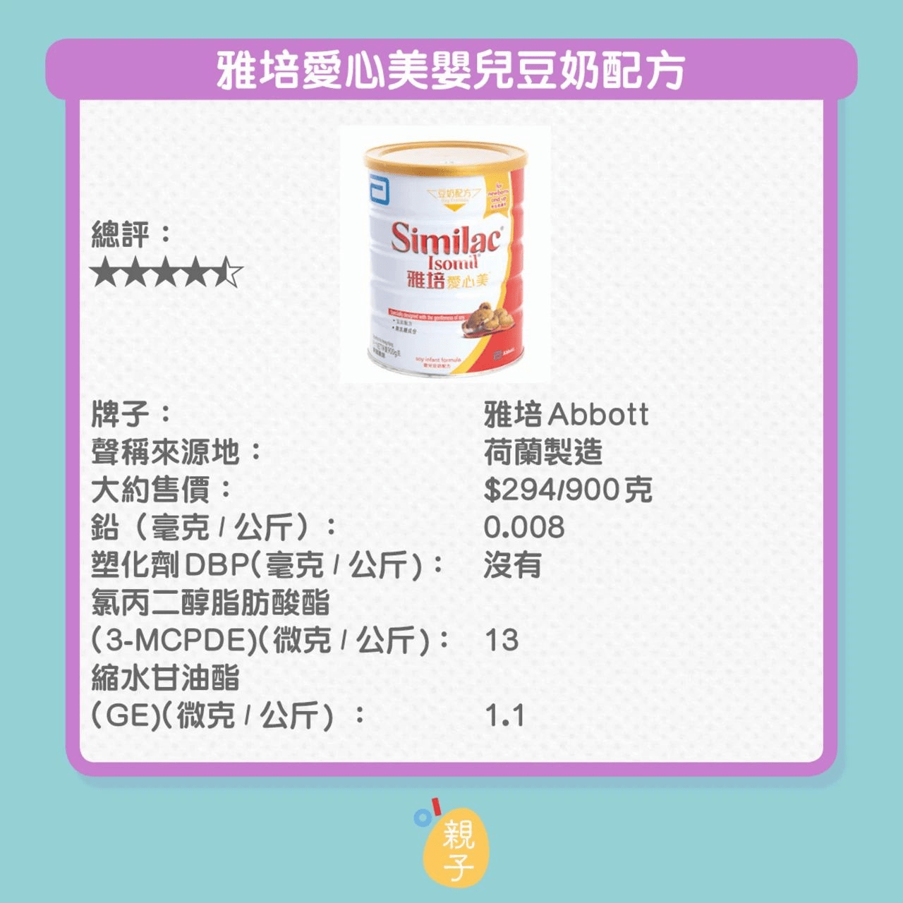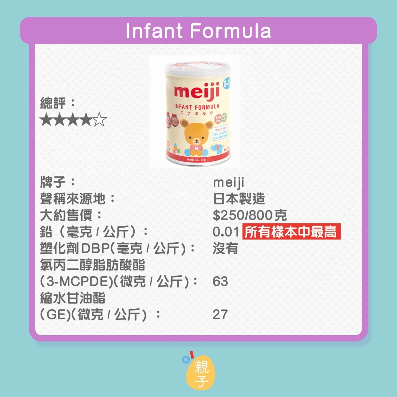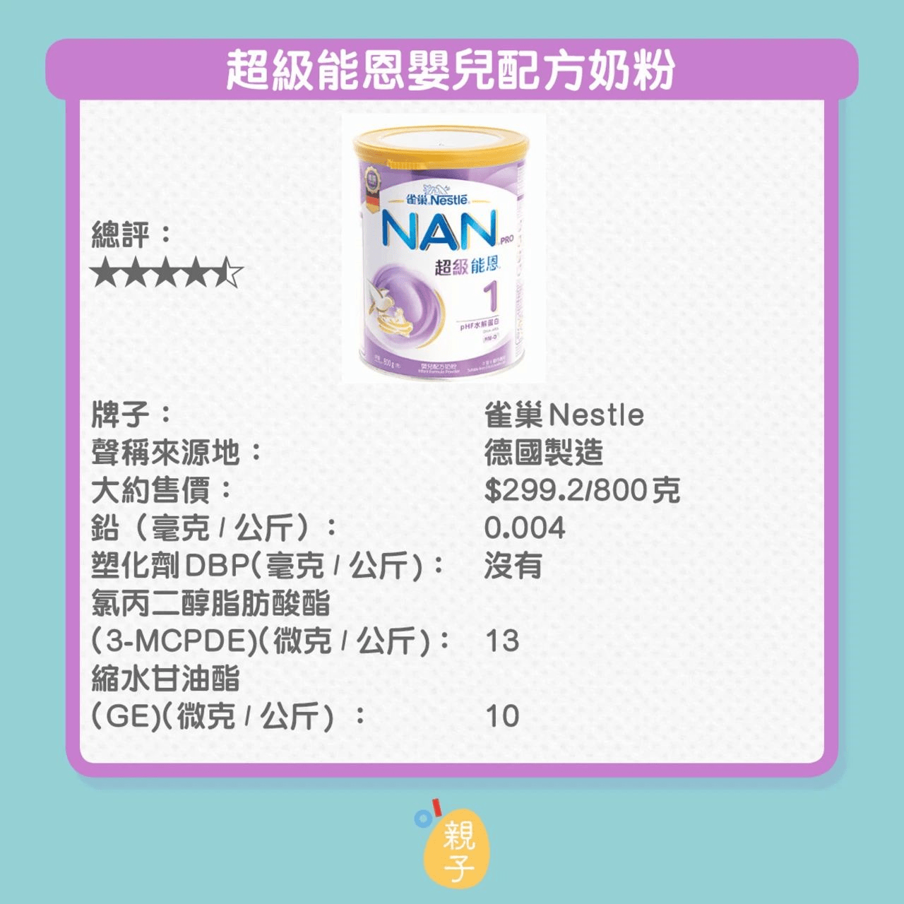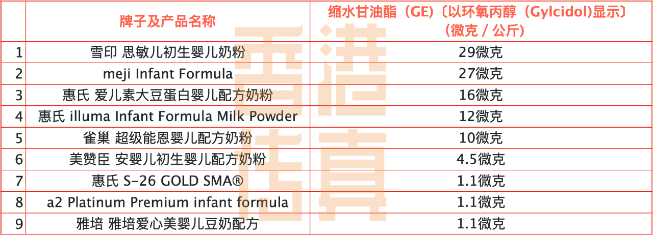 日前,香港消委会检测了15款密封包装婴儿配方奶粉,而在昨天(8月17日),香港消委会举行了记者会,公布了近期对婴儿配方奶粉及薯片、虾条等香脆零食样本的检测结果。 结果显示,15款密封包装婴儿配方奶粉均含有污染物氯丙二醇(3-MCPD),食用过量或损害肾功能或男性生殖能力。而当中含量最高的是“BELLAMY'S ORGANIC”,每公斤含有120微克3-MCPD,若按建议份量喂哺婴儿,会超出欧洲食物安全局的建议摄入限量。同时,有9款样本测出含有具基因毒性、致癌性的缩水甘油酯(GE),含量最高的样本为“雪印”,但低于欧盟规定的每公斤50微克上限。 这次不是国产奶粉,是9款进口奶粉!以下9款含致癌性环氧丙醇奶粉,请查看根据联合国粮食及农业组织/世界卫生组织联合食品添加剂专家委员会(JECFA)及欧洲食物安全局的报告,实验动物长期每日摄入过量的氯丙二醇,会损害肾功能和影响雄性生殖系统。 以下图片按照致癌性环氧丙醇含量由高到低排列! 氯丙二醇是啥?氯丙二醇其实是某些食物和配料在加工制造过程中(例如加酸水解、烘焙和烧烤等)中产生的污染物。它具有基因毒性及致癌性,环氧丙醇以缩水甘油酯(GE)存在于食物中。 其实对于成年人,其实是可以耐受一定致癌物氯丙二醇! 世界委员会把氯丙二醇的暂定最高每日可容忍摄入量定为每公斤体重2微克。 因为致癌物氯丙二醇的毒性主要通过肠道释放出来,欧洲食物安全局提出每日可容忍摄入量不适应于12周以下婴儿! ❤对于婴幼儿饮食中应该是氯丙二醇是应该被明确被禁止的! 本次被检出氯丙二醇奶粉中,量最高的是每1公斤含有29微克,即100g中高达2.9ug! 对于小婴儿,尤其是一段喂养的宝宝,最好选择婴童店的奶粉,中文标签的奶粉! 如果宝宝已经吃过了,建议不要继续吃了,孩子长期累积大量的氯丙二醇也可能造成不可逆的伤害,影响孩子肾脏和生殖系统健康。 哪些食物中含有氯丙二醇?绝大部分经加热处理的食物及/或油脂含量较高的食物都含有到氯丙二醇脂肪酸酯, 以“饼干、“油脂”、“零食”和“中式糕点的氯丙二醇脂肪酸酯平均含量较高,分别为每公斤440微克、390微克、270微克和270微克。具体数据见下表: 因此母乳喂养妈妈应减少煎炒、油炸、烧烤、烘焙食物摄入,因为氯丙二醇是可以通过母乳传递给孩子的!成年人当然也要适当减少油炸等食物摄入。虽然说此次奶粉中检出含量对比以上食物是极少的,但是小婴儿最好是一点都不要摄入!更安全!