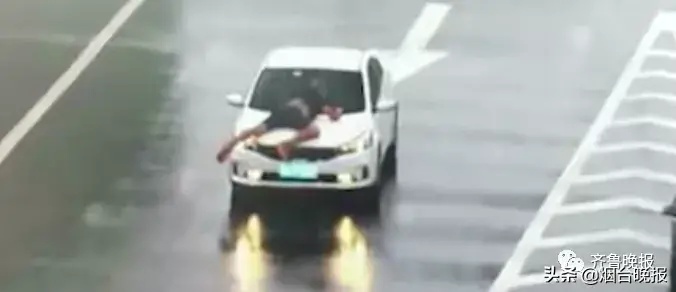 男子趴在引擎盖上,紧抓雨刮器,