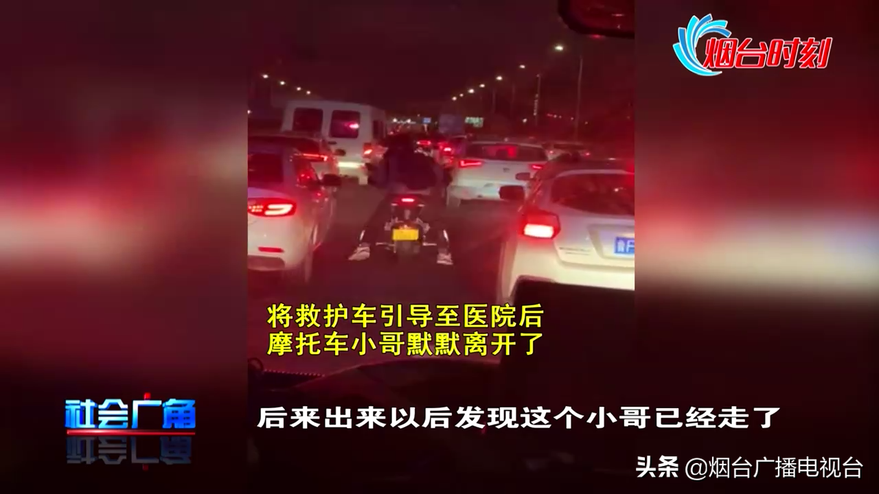 在车辆让开道路后,摩托车小哥又示意救护车驾驶员跟随摩托车继续前行。从烟台开发区看到救护车开始,这位摩托车小哥一路引导车辆让路,一直把救护车送到了毓璜顶医院。