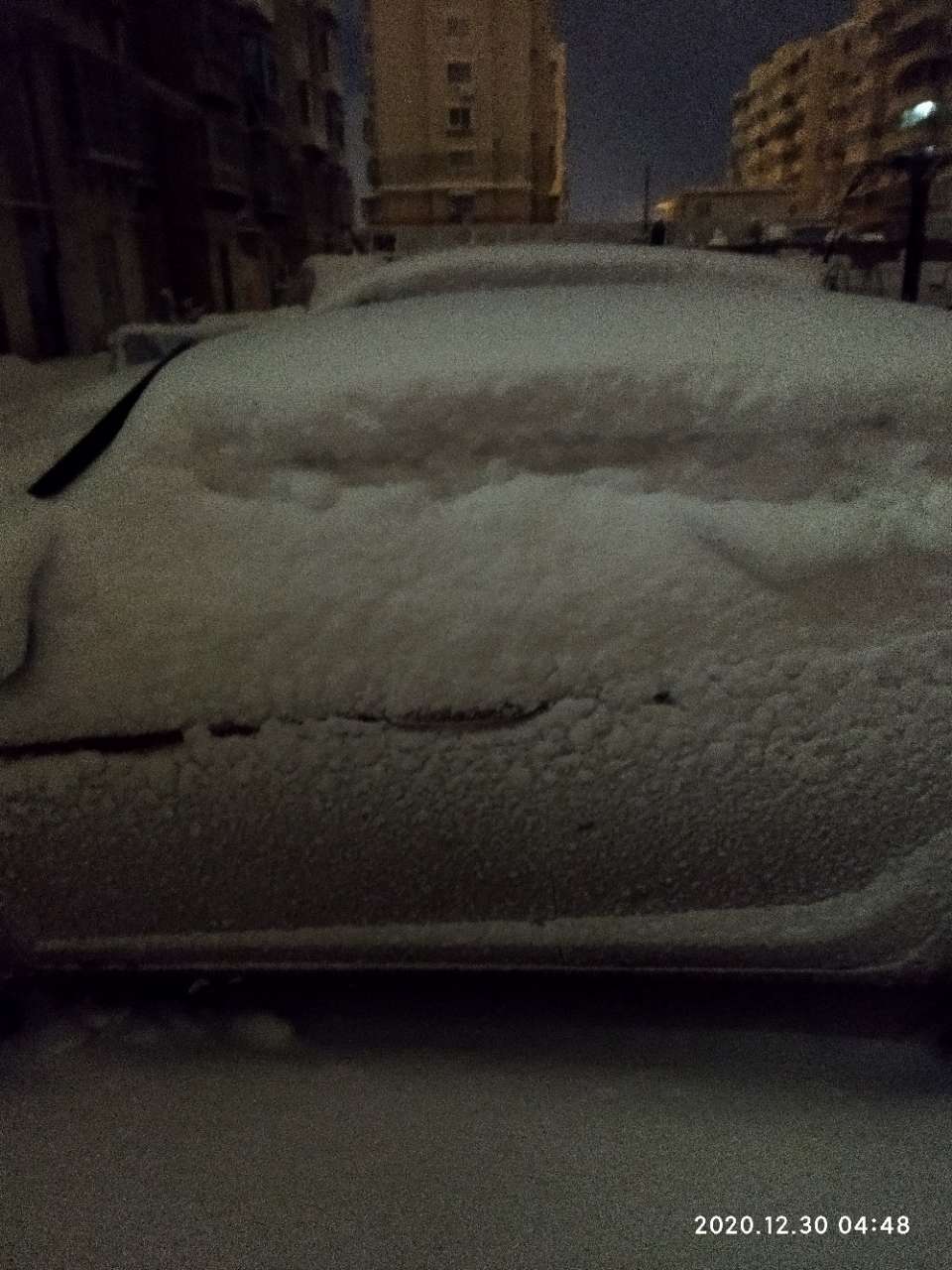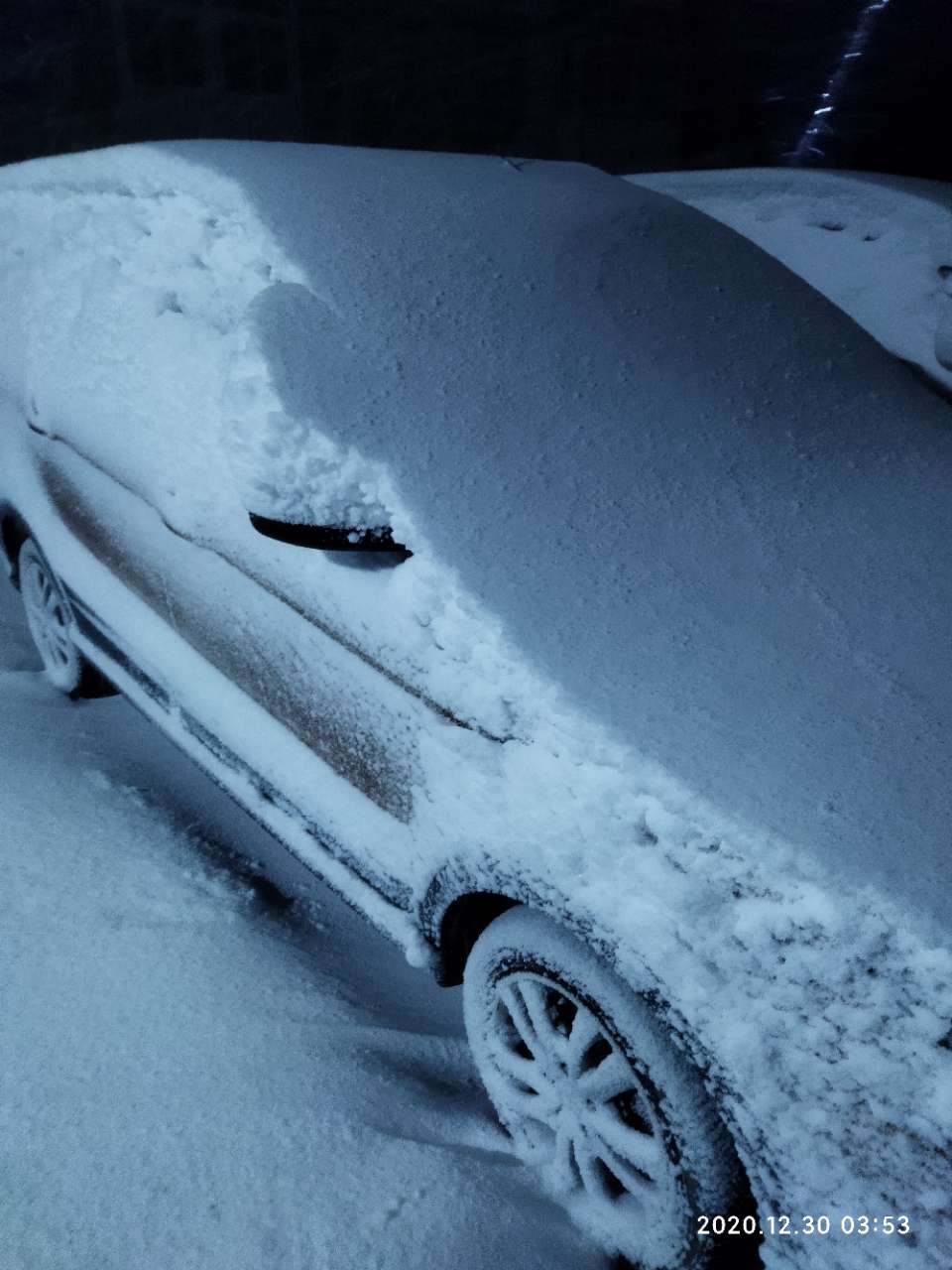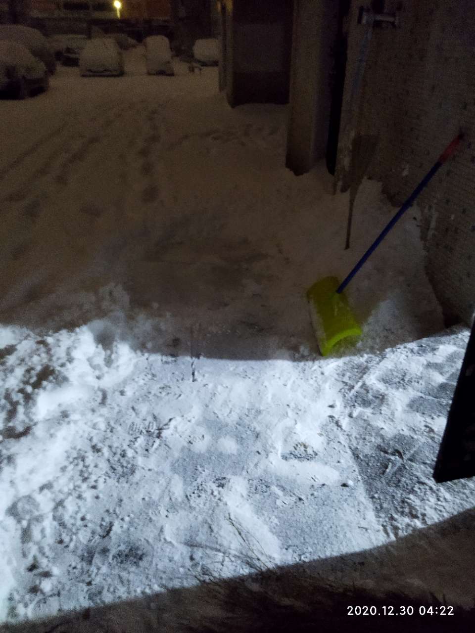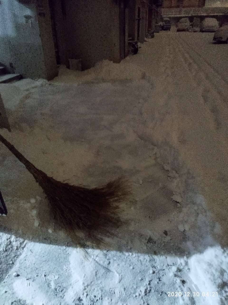 刚把车扫出来,夹在两个楼中间,车上有20公分左右吧,地上没有这么厚,物业正在清扫地面,还不错