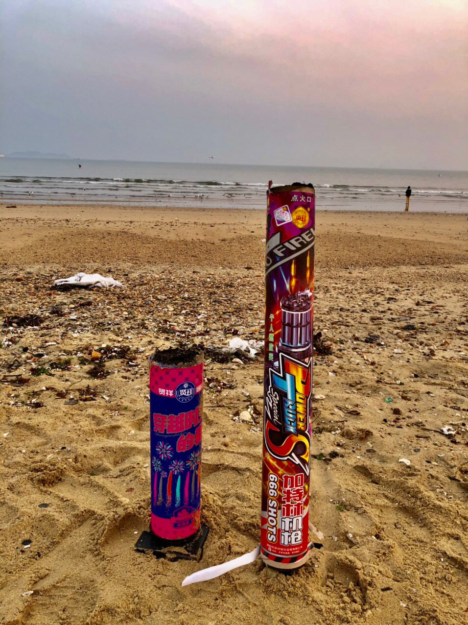 从去年开始海边就出现了这类“烟花”筒子,它放出来什么效果不知道,大概可能是燃放环保不算“烟花”类吧,销售也就不受时间限制了。看名子叫的挺响亮“机关枪”,玩起来应该声色并茂,所以海边每天都会留下废筒,有少量的掉到海里成了垃圾。临近春节估计今年放它的人不少,希望在海边燃放后最好把它们放在容易收集的地方,让节日里的海边保持干净整洁……