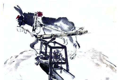 ″小铁牛"欢快的拉着水车也不知累,一弦清水源源不断地随着水车流出,奔向了瓜地。
