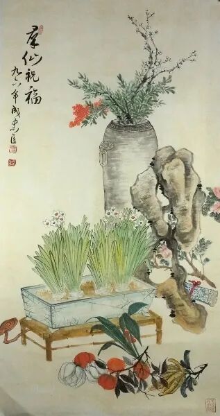 清供始于秦汉盛于明清,从宋代开始清供被认为是文人雅士的风雅标志之一。由于宗教的兴盛和文人性情所致,唐宋时期的文人士大夫阶层把这种习俗推向高潮。至明代时,清玩之风表现的有增无减之势,已经成为文人之间的普遍现象。世人把宋人喜好的清供习俗作为典范加以效仿,将清供这一文化生活作为时尚延续下来。由于世人追求雅逸,崇尚清供的同时社会上出现了一大批画家,他们将“清供”作为题材而进行专题创作。 成忠臣作品 到了清代,清供图的形制逐渐成型,清供绘画发展到了鼎盛时期。到了清中期以后,帝王将相的喜好又更加推动了清供画的发展。清代乾隆皇帝是这种习俗的大力倡导者,在他的推动之下,宫里掀起了岁朝清供热,以“岁朝图”为题材的绘画发展达到高峰。清供文化艺术的传承将清供习俗演绎成一种文化,出现了大批对这一习俗的虔诚与痴迷者。 成忠臣作品 成忠臣作品