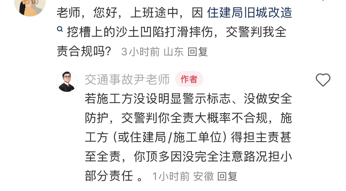 sailortu 发表于 2025-10-24 09:31 我投诉的对象可能是相关部门,说实话,跟某些部门打交道很难。不是简单的维权,买个东西什么的!我现在一天打一次12345!我因住建局旧城改造项目挖槽上面沙土凹陷打滑摔伤,交警说开交通事故责任书判我全责,可是按照交通安全法105条,施工方未设置警示标识,未采取安全措施或道路毁损,需要对行人进行赔偿的。投诉12345,判我全责的法律依据是什么?交警一直也不管。我想起诉,住建局也不告诉我施工方负责人是谁,我也没法起诉。施工方上来就起诉去吧,我问他负责人信息,告诉我我没必要知道! |