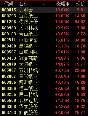 5月24日早盘,造纸板块大幅拉升,领涨两市。截至发稿,美利云、宜宾纸业、岳阳林纸等4股涨停,青山纸业、中顺洁柔、晨鸣纸业等多股纷纷跟涨。
