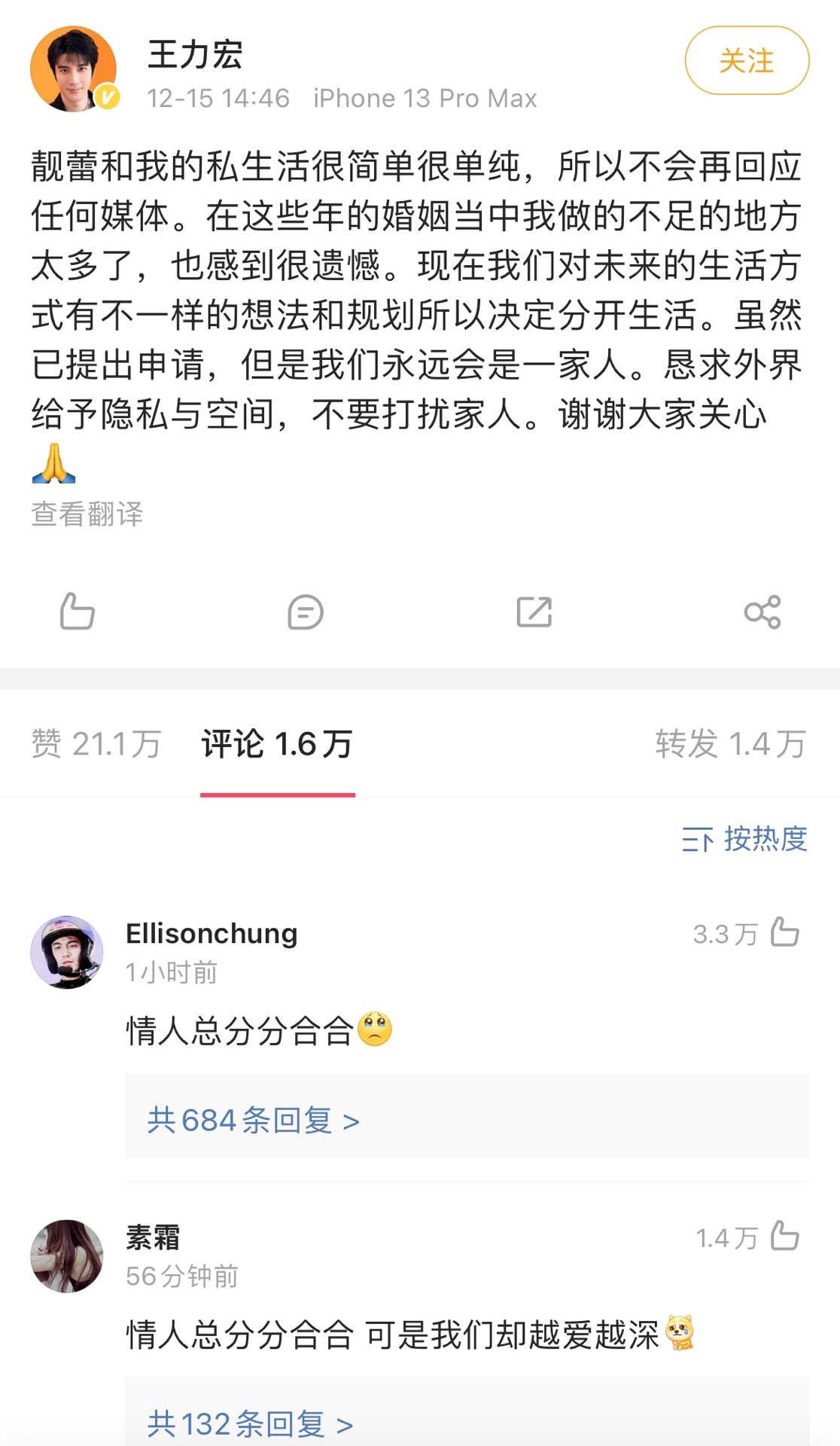 ÍõÁ¦ºê»ØÓ¦Àë»é£º¾ö¶¨·Ö¿ª£¬ÒÑÌá³öÉêÇ룡 |